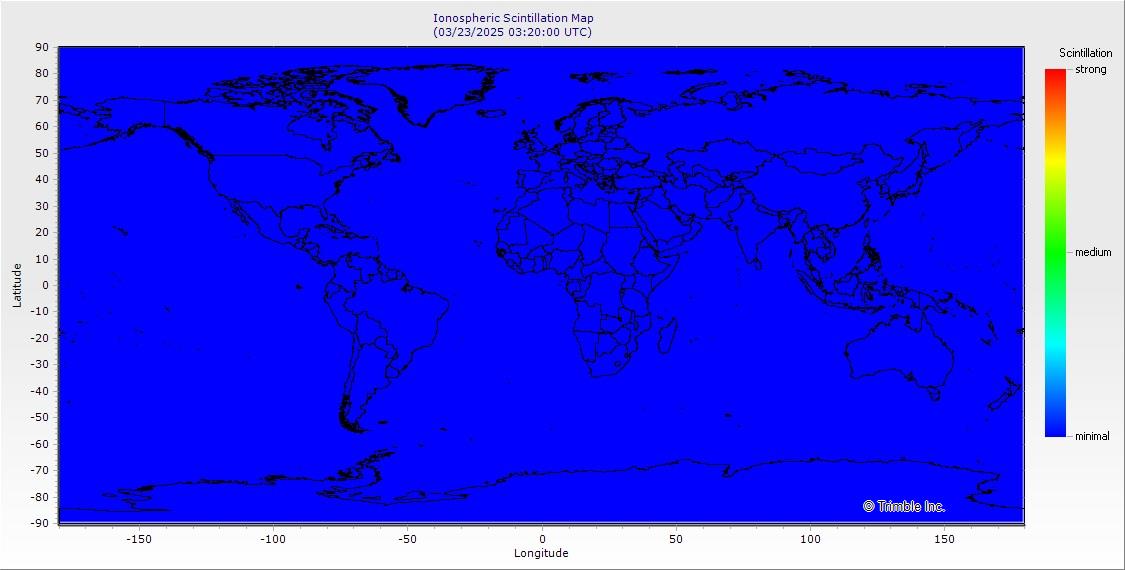 This map shows the current scintillation events as observed and modeled by Trimble’s global reference station network. Avoiding scintillation, or taking multiple observations of a point during different periods of the day, and different ionospheric conditions, can increase reliability. This map is updated every 10 minutes.