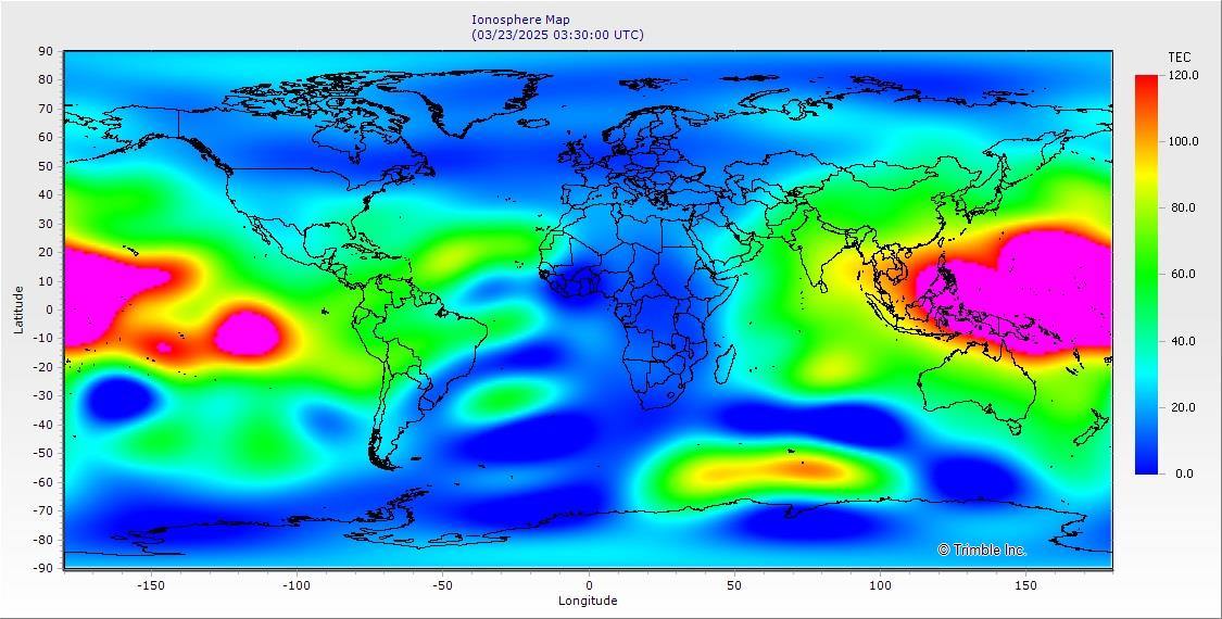 This map shows the current TEC as observed and modeled by the Trimble® global reference station network. These maps are updated every 10 minutes.